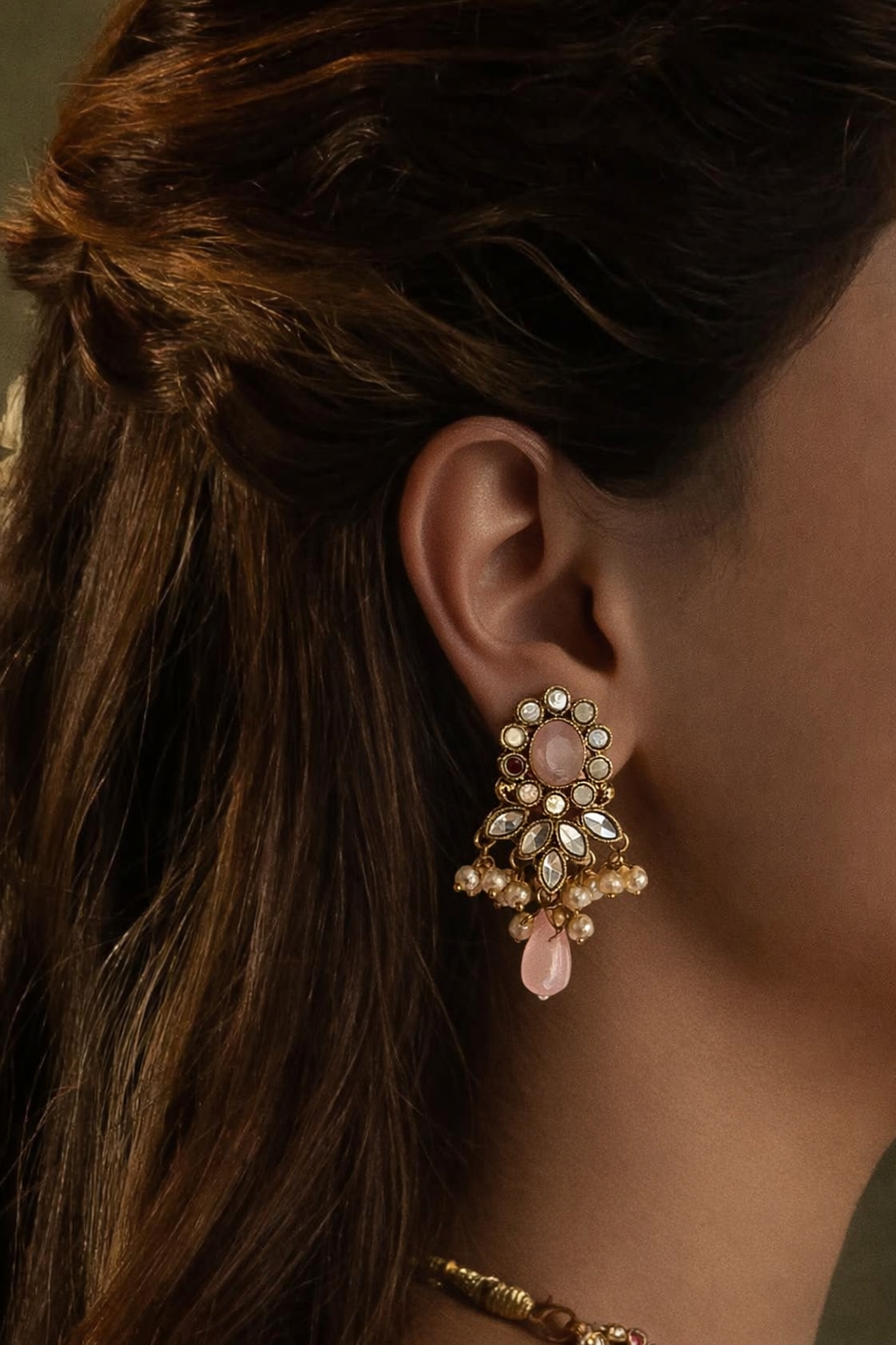 Delicately handcrafted in traditional kundan work, the Farida earrings feature soft blush stones framed by classic polki detailing, finished with pearl clusters and a subtle rose drop. Elegant yet timeless, they’re designed to add quiet grace to festive looks, intimate gatherings, and heirloom-inspired styling.