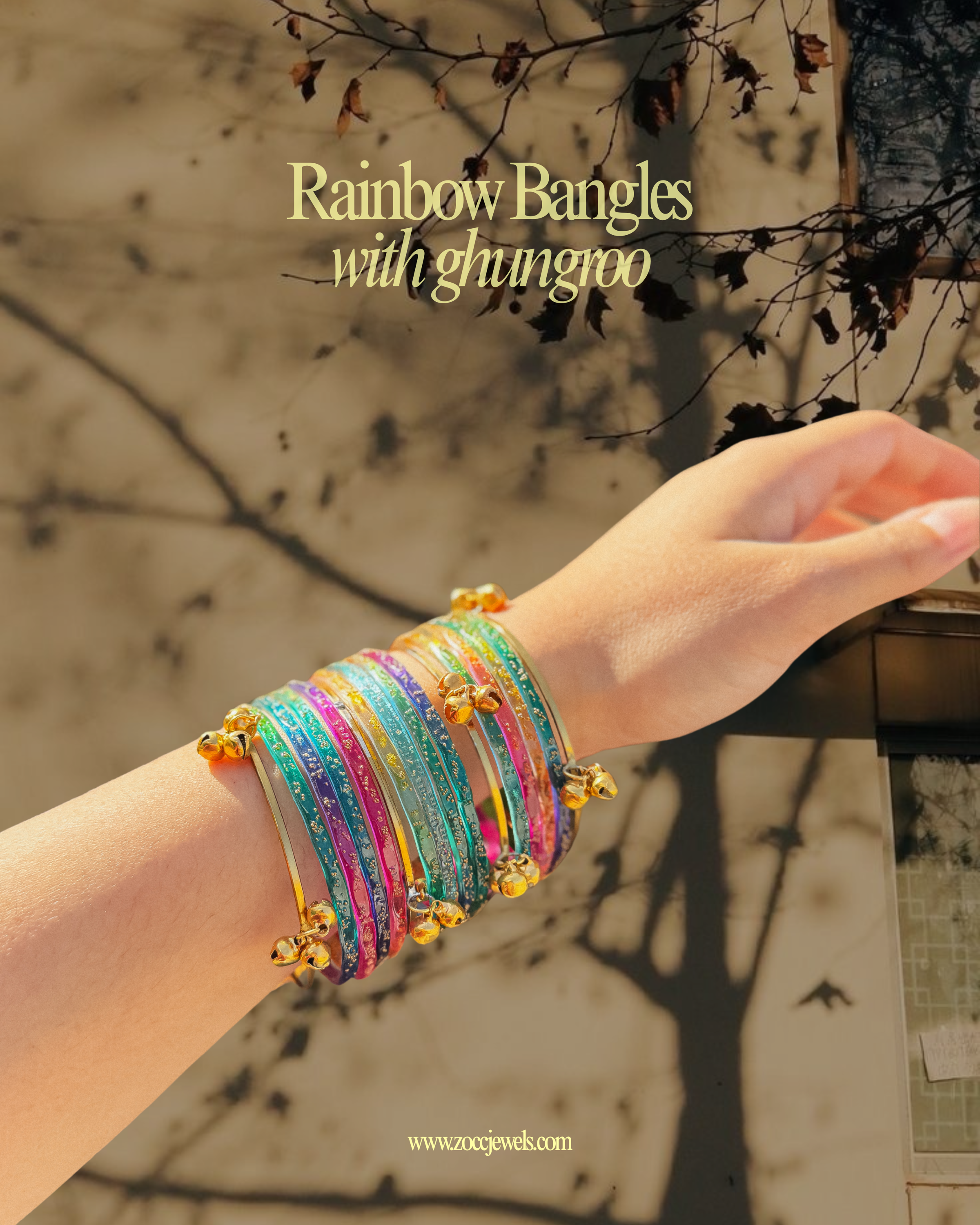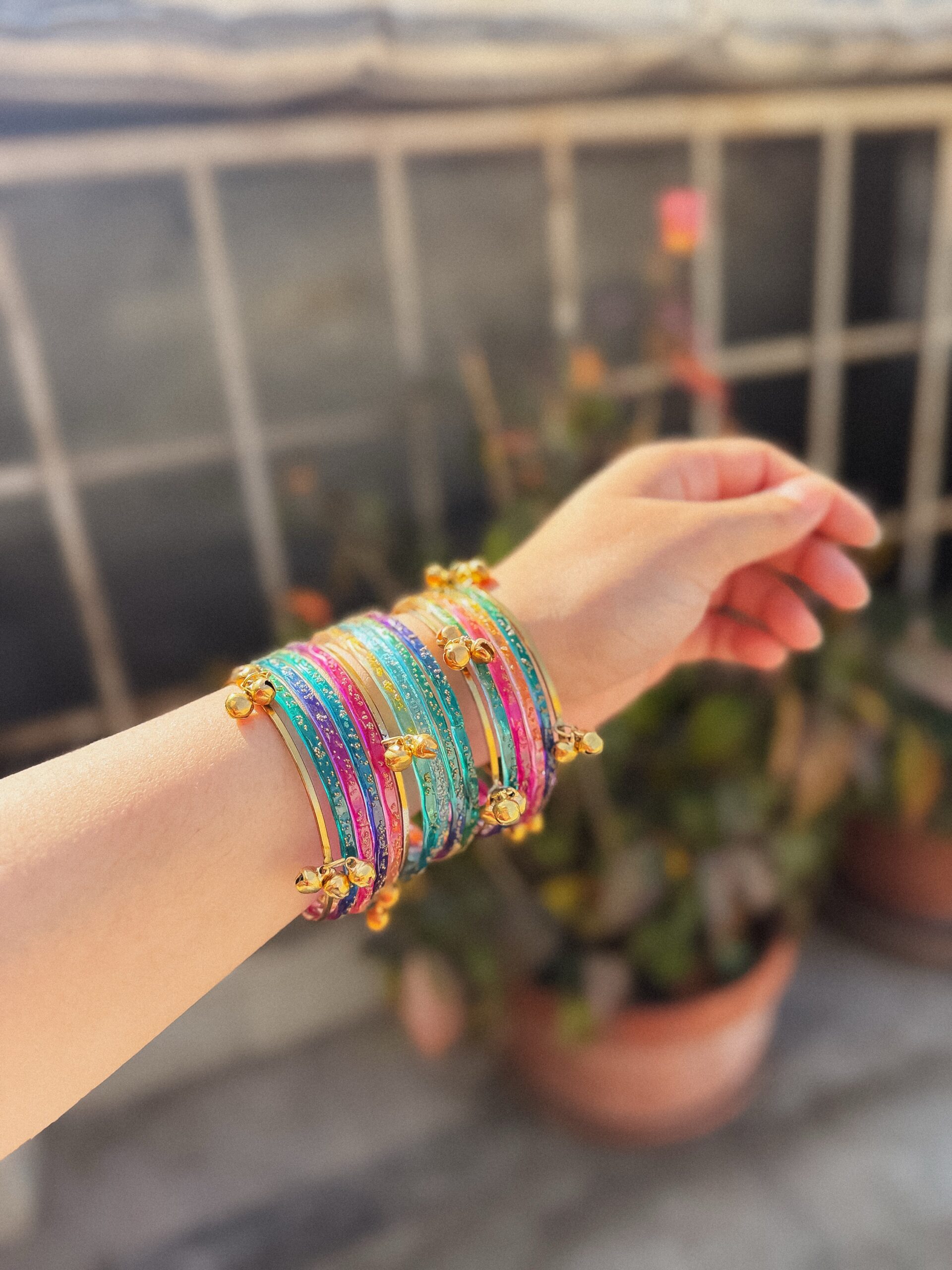 Multi colored 12 pcs glass bangles with 4 golden ghungroo karay